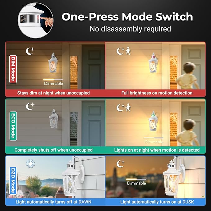 - Upgraded Motion Sensor: Our latest motion sensor porch light has 4 different working modes.1.DIM mode: 100% brightness when motion is detected at night, 30% brightness the rest of the time. 2.ECO mode: Keeps the lights off at night, turning on at full 100% brightness when motion is detected. 3.D2D Mode: Keep 100% brightness all night and turn off at dawn. 4.ON Mode: 100% brightness for all day. No sensing function. Manual control of the light fixture is available!
