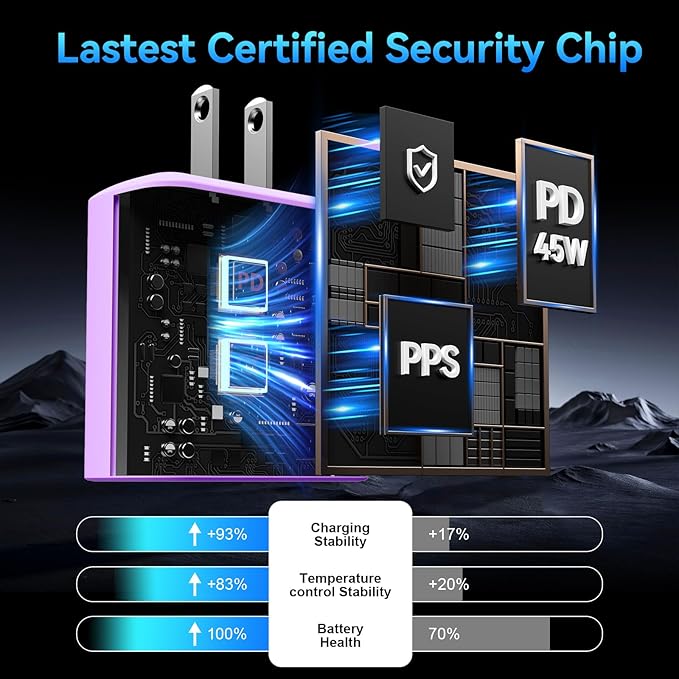 - 【Safety 45W USB-C Charger】 This 45 Watt usb c charger for samsung super fast charging block multiple built-in safeguards protect your devices against damage caused by short circuit, over-current, over-voltage, over-heating, and over-charging issues. Automatically stops charging when battery capacity is full to keep your device safety and longevity