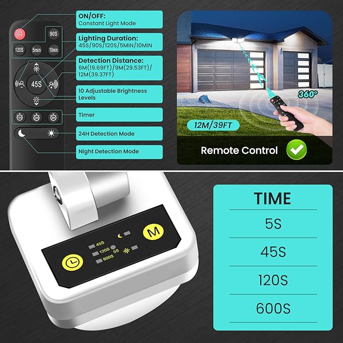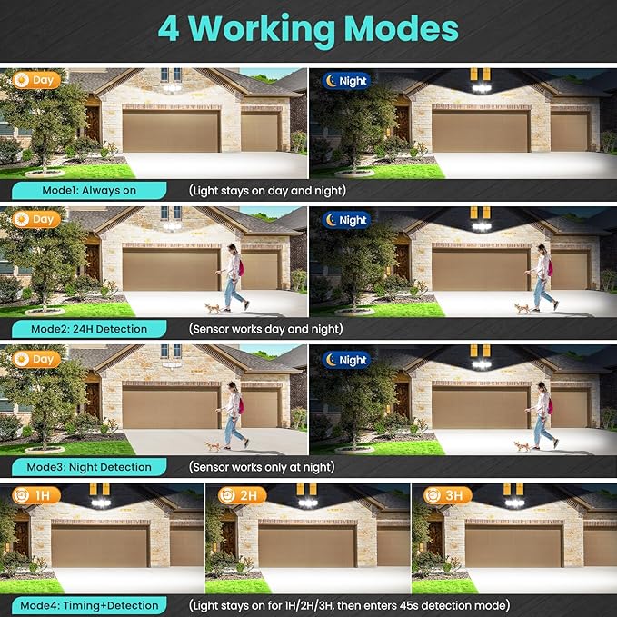 - 【4 Working Modes for Every Scenario】Select from 4 versatile modes: 24-Hour Detection, Night-Only Detection, Continuous Light, or a customizable Timer (1/2/3 hours). In sensor mode, the light intelligently turns off when no motion is detected, This flexibility allows you to tailor the lighting to your daily routine, offering both convenience and reducing power consumption