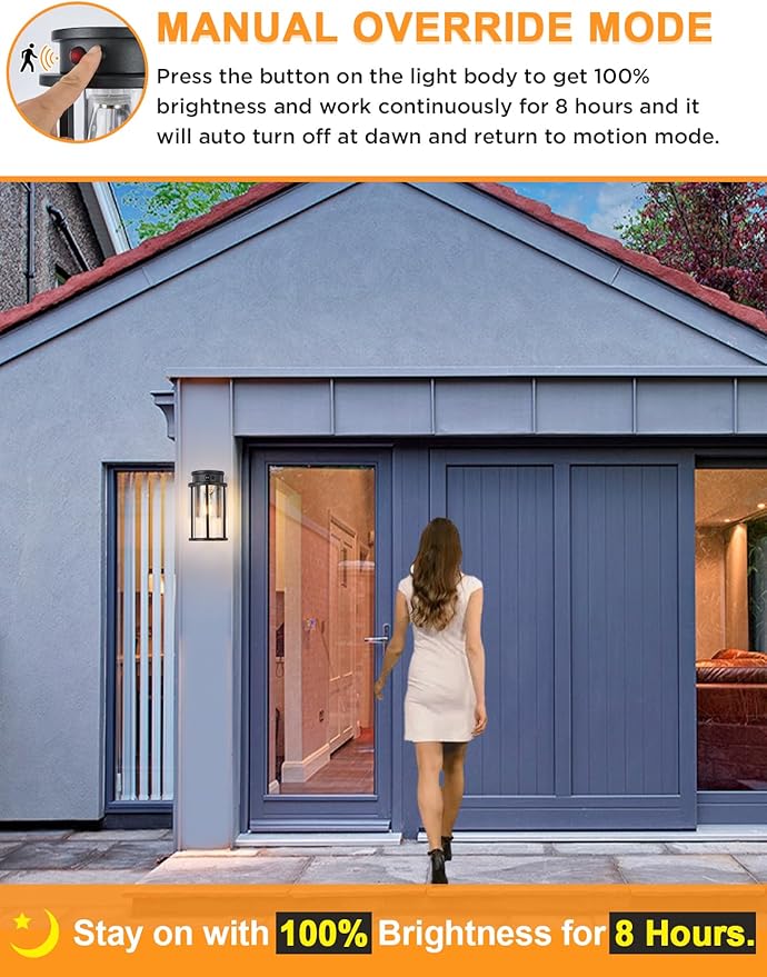 - 🏡【Motion Sensor & Dusk to Dawn Sensor】We innovatively combine 2 sensor technologies (PIR motion sensor and IC dusk to dawn light sensor) in the outdoor wall lanterns to realize your smarter lighting. The light will auto turn on at dusk and off at dawn. Enjoy peace of mind knowing your entryway is always well lit when arriving home at night.