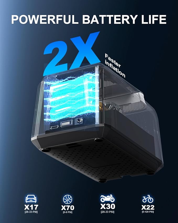 - 2X Faster Tire Inflation: The auto tire inflator portable air compressor is equipped with an advanced durability and heat dissipation management capabilities, which provides high-speed airflow and faster heat dissipation. The car tire air pump portable can quickly inflate vehicle tires within minutes, with a pressure accuracy of up to 150PSI. Suitable for car, motorcycle, bicycle, and sports balls, allows you to quickly replenish the tire pressure, making daily life and travel more convenient.