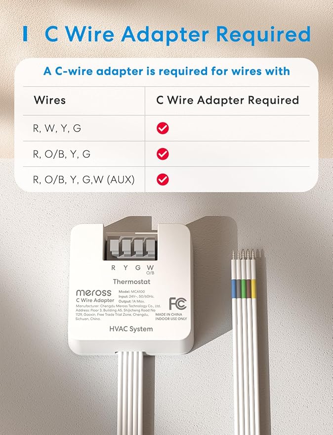 - Note: This wifi thermostat requires a C-wire (common wire) for proper functionality. If your HVAC system does not have one, you can search for "meross C-wire adapter”to purchase a compatible adapter. This thermostat only supports 2.4GHz Wi-Fi networks