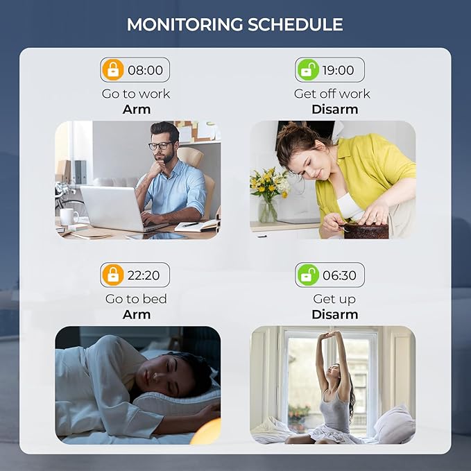 - 【Powerful Deterrence and Peace Of Mind】This Home Alarm System is your first line of defense and Once triggered,it blasts out an ear-piercing siren at an extremely high decibel level.This loud Siren noise is a major deterrent to potential burglars or intruders.The moment they hear it, they'll know their illegal activities have been detected, causing them to flee immediately, thus safeguarding your property and loved ones.By Phone App,you can receive the instant alerts and control it anywhere though you are not home for holiday or work.