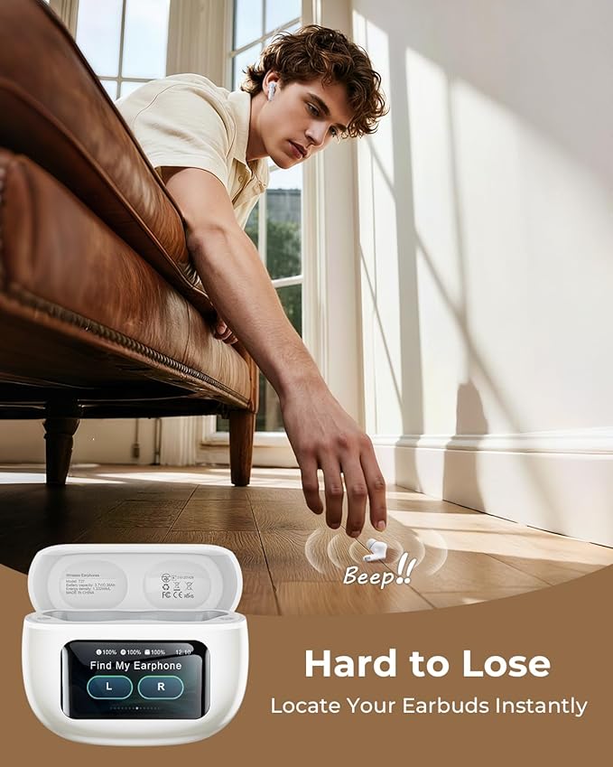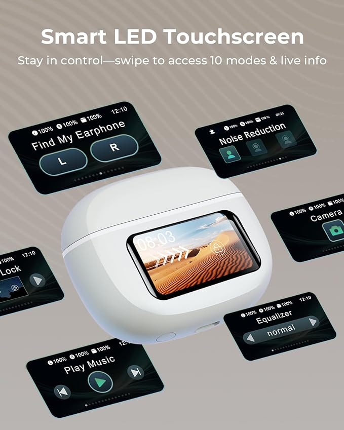 - Smart Touchscreen Case for Effortless Control: Our wireless earbuds come with a smart charging case that does more than just charge. Unlike traditional cases, it features a responsive touchscreen—skip tracks, adjust volume, manage calls, take remote photos, or locate your earbuds with just a tap or swipe. Packed with 10 powerful functions in one compact case, it’s the ultimate control hub. No phone needed, making everything more convenient and smarter.