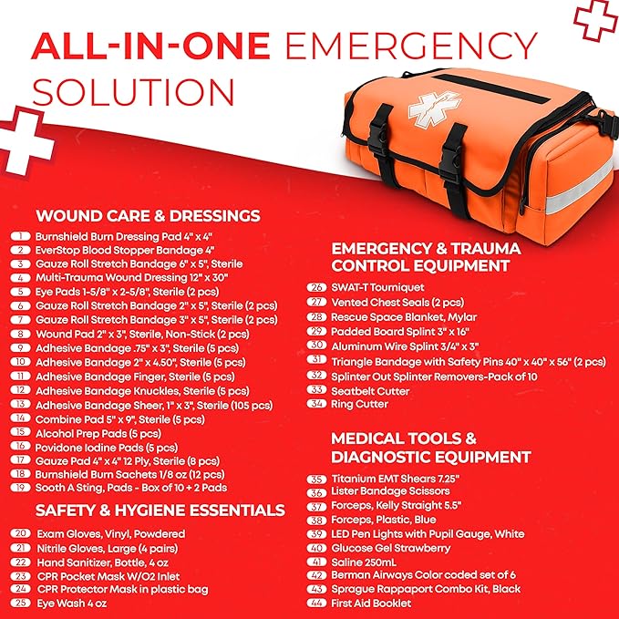 - FULLY STOCKED EMERGENCY TRAUMA KIT: This trauma bag is prefilled with 174+ critical medical supplies to support first responders in severe injury scenarios. Includes trauma dressings, gauze pads, compression wraps, antiseptic wipes, CPR shield, gloves, and splinting materials—all neatly organized for rapid access.