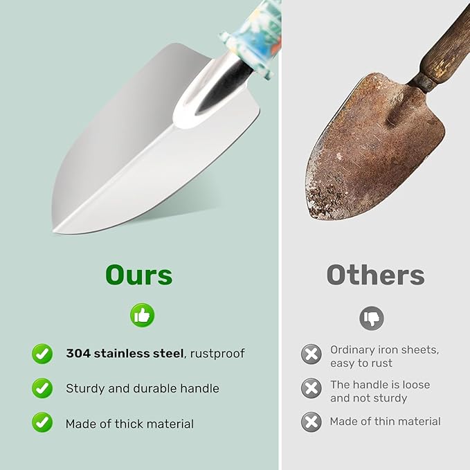 - Rust-Resistant 304 Stainless Steel Build--Built to last with heavy-duty 304 stainless steel, these tools resist corrosion and bending even in tough soil. Unlike flimsy plastic or coated metal sets, they stay sharp and sturdy season after season