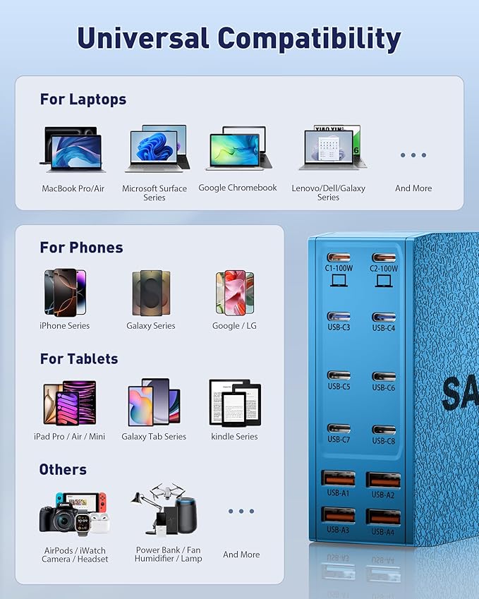 - 【Universal Compatibility】Our USB C charging station is equipped with 2*100W and 2*65W fast charging ports, which can charge 3 or more laptops at the same time. Compatible with smartphones, tablets and laptops, suitable for MacBook Pro/Air, Dell XPS, iPad Pro, Phone 16/16 Pro Max, Phone 15 Pro Max, Phone 14/13 Pro/12 Pro Max, iWatch, AirPods, Surface Pro, Galaxy S24 Ultra, Switch, Steam Deck, Google Pixel and many other devices.