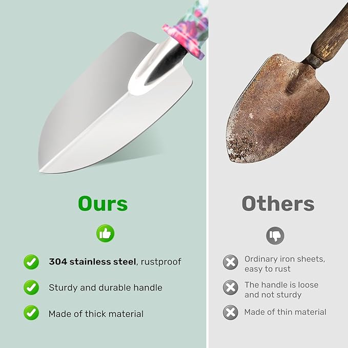 - Rust-Resistant 304 Stainless Steel Build--Built to last with heavy-duty 304 stainless steel, these tools resist corrosion and bending even in tough soil. Unlike flimsy plastic or coated metal sets, they stay sharp and sturdy season after season