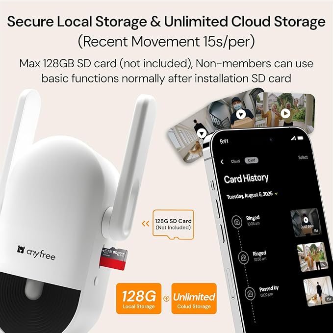 - [Local Storage] Doorbell camera wireless no subscription. Local storage supports SD cards up to 128GB (SD card not included) , Install SD to keep motion detection no monthly fees