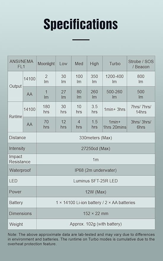 - DUAL MODES FOR EVERY NEED: P2A features Tactical Mode for instant 1200-lumen Turbo power with a 330-meter beam distance, activated by the tail switch, and Everyday Mode with 5 brightness levels (Moonlight to Turbo) plus emergency functions like Strobe, SOS, and Beacon. Perfect for both professional and daily use.