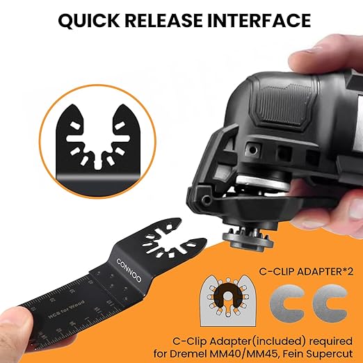 - Wide Compatibility: Works with most major oscillating tool brands, including Fein Multimaster, Ryobi, Milwaukee, Hitachi, Black & Decker, Craftsman, Bosch, Dremel, Makita, Rockwell, Ridgid, and more. Includes C-clip adapters for Dremel MM40/MM45 and Fein Supercut.