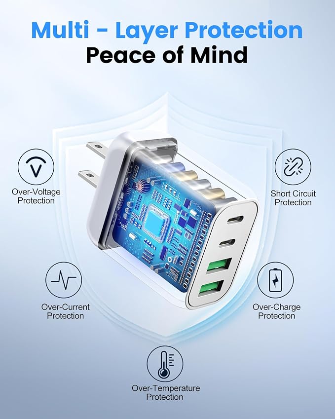 - 【4-Port Fast Charging Block】Designed with two USB-C and two USB-A ports, this charger block lets you power multiple devices—like your phone, tablet, and wireless earbuds—at the same time, eliminating the need to wait for one to finish charging. No more carrying multiple bulky adapters—This space-saving wall charger brings convenience, speed and portability wherever you are.