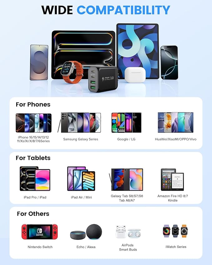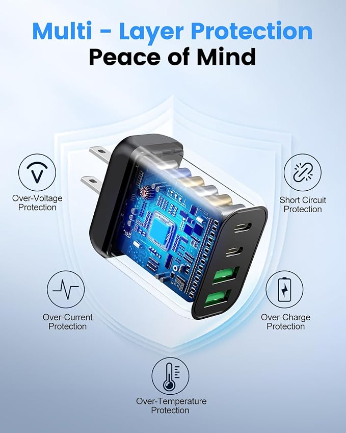 - 【4-Port Fast Charging Block】Designed with two USB-C and two USB-A ports, this charger block lets you power multiple devices—like your phone, tablet, and wireless earbuds—at the same time, eliminating the need to wait for one to finish charging. No more carrying multiple bulky adapters—This space-saving wall charger brings convenience, speed and portability wherever you are.