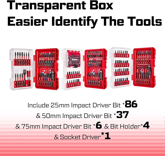 - Storage Box: The clear box allows you to see the contents at a glance, and the included storage box is compact for easy removal of bits and customized placement. It features dedicated slots for individually storing each screwdriver bit