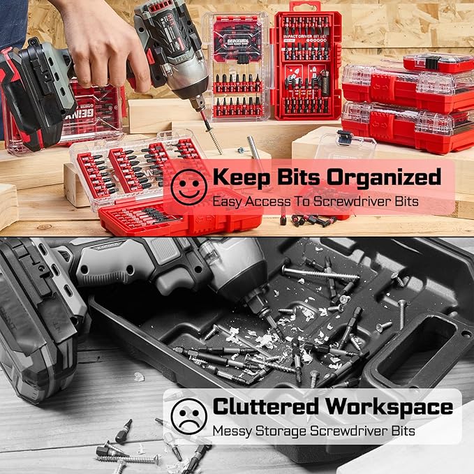 - Storage Box:The clear box allows you to see the contents at a glance, and the included storage box is compact for easy removal of bits and customized placement. It features dedicated slots for individually storing each screwdriver bit.