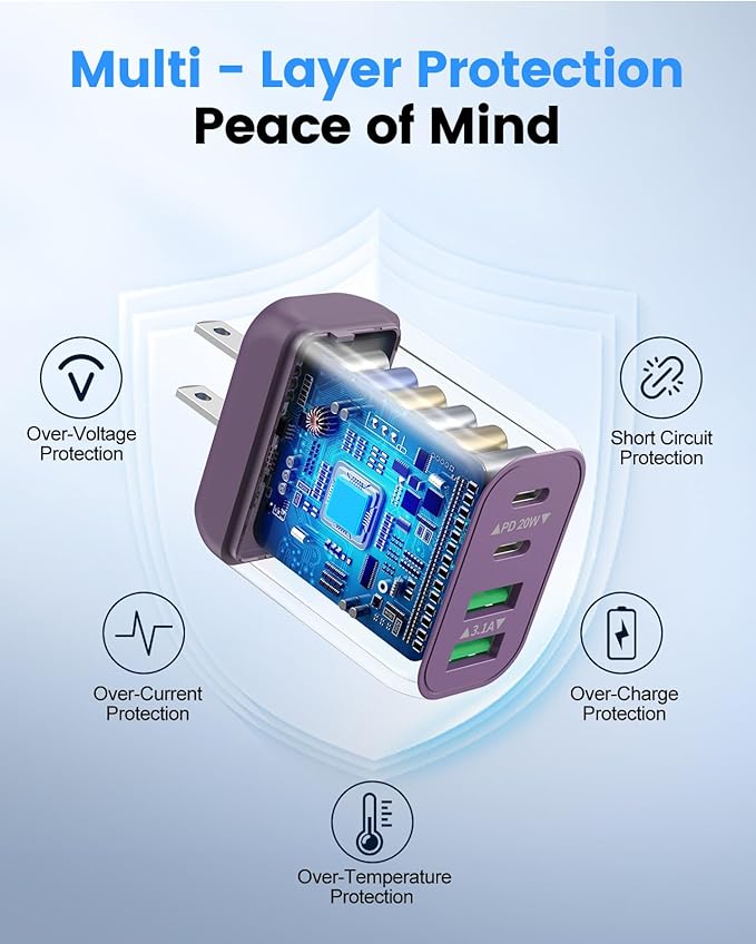 - 【4-Port Fast Charging Block】Designed with two USB-C and two USB-A ports, this charger block lets you power multiple devices—like your phone, tablet, and wireless earbuds—at the same time, eliminating the need to wait for one to finish charging. No more carrying multiple bulky adapters—This space-saving wall charger brings convenience, speed and portability wherever you are.