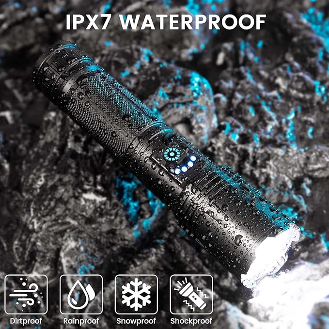 - 【Overcharge Protection & Zoomαble】Both the Βattery and the led flashlight feature a smart chip with overcharge protection, ensuring safety during charging and allowing you to rely on them for extended periods. In addition, flash light has a telescopic function, you can adjust the beam from narrow to wide.