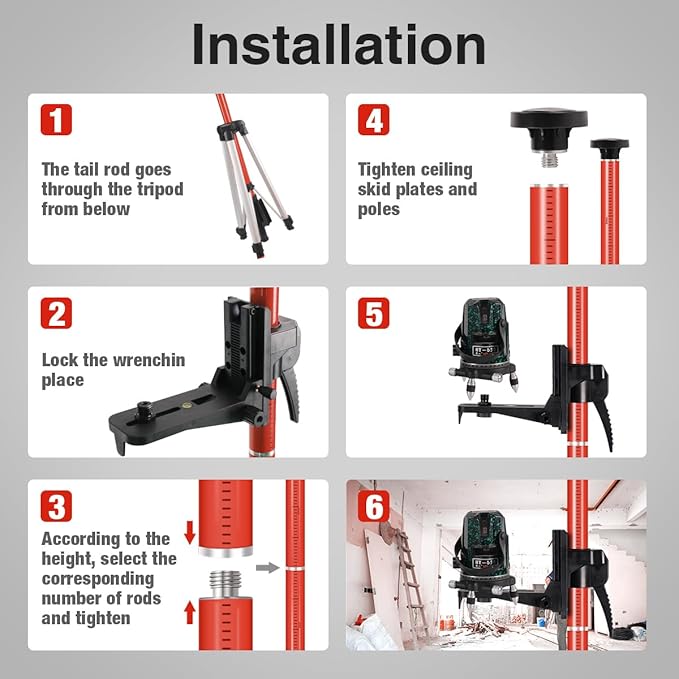 - 【Highly Stable Spring-loaded Base】The lasers' mounting bar features a spring-loaded base for quick and easy tension setting. You don't have to worry about the lasers' shifting or going out of alignment because the rod end is equipped with a spring that presses tightly against the ceiling, beam or floor. Non-slip surfaces on the footplate and headplate, and a larger force area reinforces the fixation of the footplate and headplate ends. Sturdy foot pedals make operation easy.