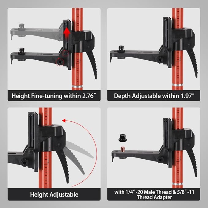 - 【Easy Mounting】The mounting bracket with 1/4‘-20 male thread and 5/8’-11 thread adapter fits standard nuts on most instrumentation and is also compatible with most linear and rotary lasers'. The bracket can be placed at any height of the rod as required.