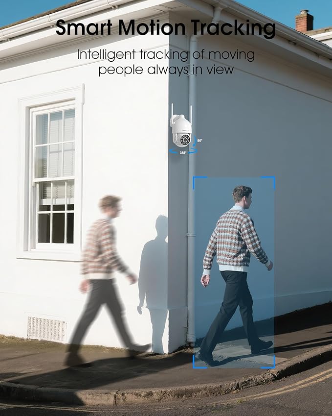 - 360° Pan-Tilt & Auto Motion Tracking: Control the security camera remotely to rotate 355° horizontally and 90° vertically for complete coverage. Smart AI motion tracking automatically follows and records movement, ensuring no suspicious activity goes unnoticed.