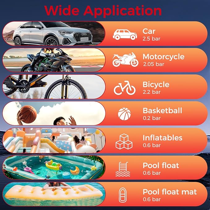 - Smart Global Modes: Five presets (car/motorcycle/bike/ball/custom) auto-adjust pressure. One-touch unit switching (PSI/Bar/kPa/kg/cm²) provides worldwide compatibility.NOTE: please read the User Manual carefully before use.
