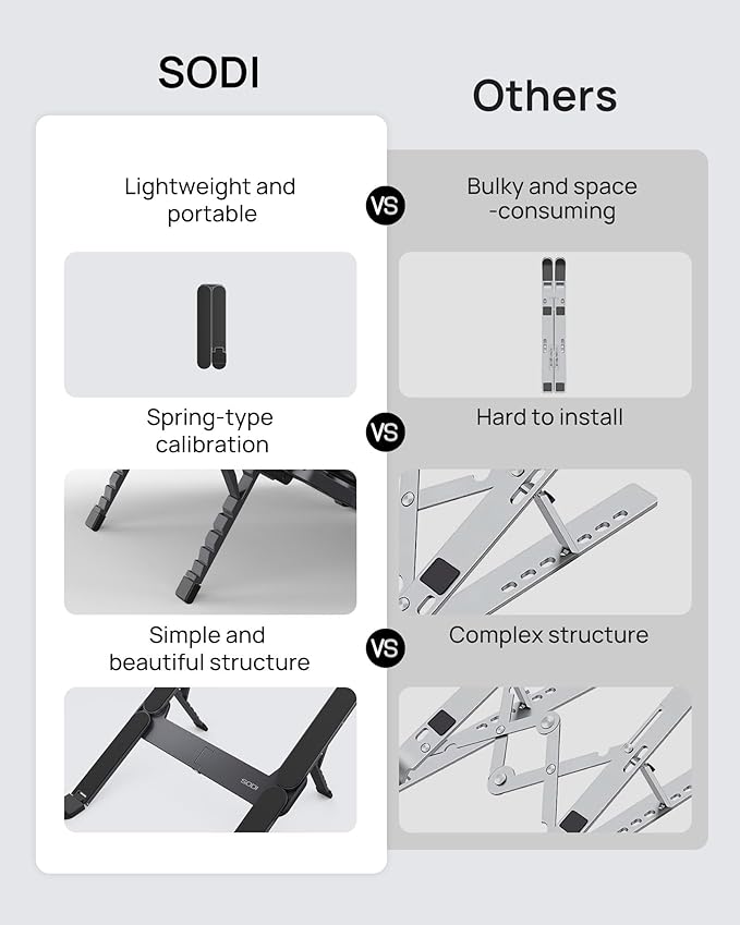 SODI Ultra Compact Foldable Laptop Stand - Portable Laptop Holder for Desk & Travel Use, Ergonomic Aluminum Computer Holder with Adjustable Height for MacBook, Tablet 10-16" (Dark Black, Bi-Fold)
