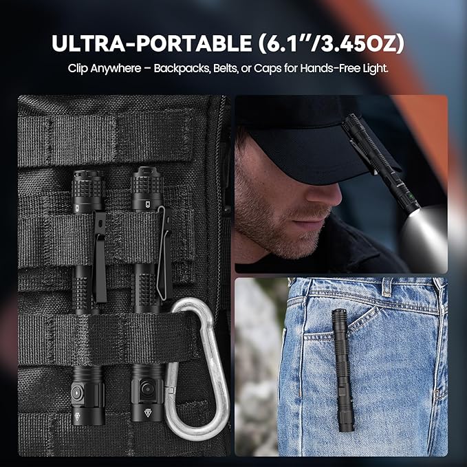 - Ultra-Portable Carry Solutions: Thin Flashlight (6.1in/3.45oz) with dual clip + lanyard. Clip to belts, backpacks or hats as hands-free pocket LED Flashlight. Essential EDC tactical light for security, outdoor & daily Use.