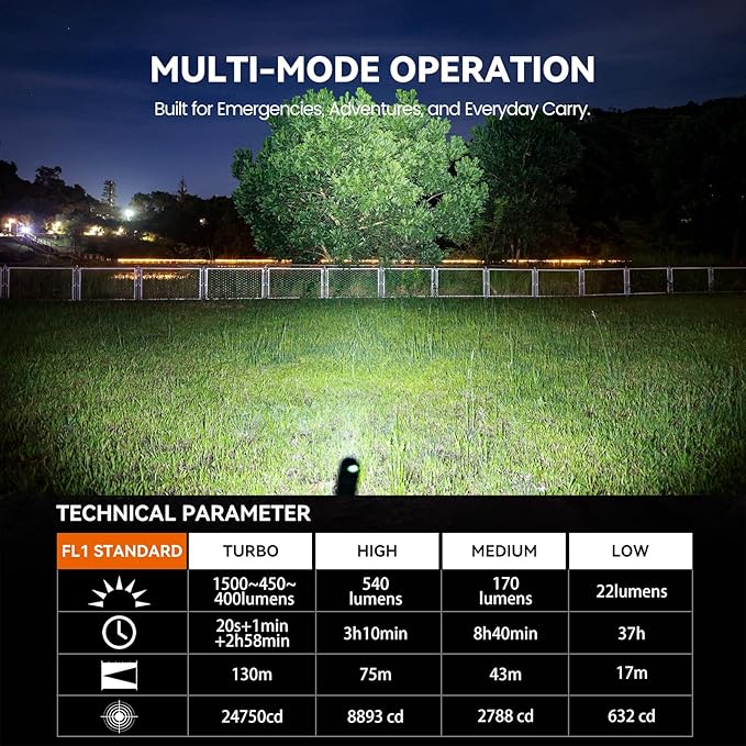 - Super Bright & Extended Runtime: High-performance LED delivers 1500 Lumen small flashlight intensity (130m beam) with low-voltage protection. The included battery supports 37hr Eco mode – ideal high lumens flashlight for outdoor adventures or security patrols.
