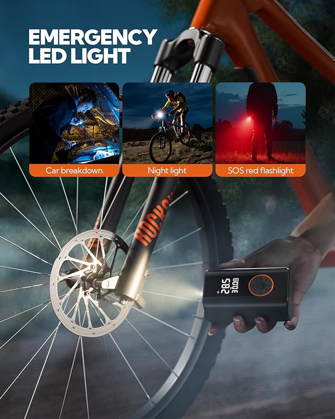 - LCD Display & LED light: The built-in LCD display is perfect for bicycle pump with pressure gauge accuracy, ensuring clear, real-time readings. You’ll see tire pressure with ease, even under the sunlight.Don't worry about night-time tire emergencies. This air compressor tire inflator features an integrated LED light that’s just as effective in the dark.