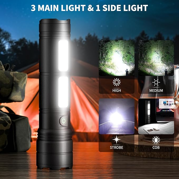 - 4 Modes & 2 Cob Lights: This handheld flashlight has 4 lighting modes, high mode, medium mode, strobe mode and side light mode, and the flashlight has 2 side lights. Just press and hold for 3 seconds to turn off the rechargeable flashlight in any mode. And adjusting the focal length of the flashlight can change the size of the beam