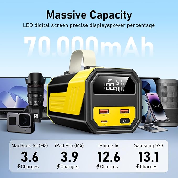 - 70,000mAh High-Capacity Power Bank:With a 70,000mAh high-capacity battery, this power bank supports multiple devices at the same time. It can charge a MacBook Air (M3) 3.6 times, an iPad Pro (M4) 3.9 times, and an iPhone 16 12.6 times, providing over a week of power. Perfect for daily use and extended outdoor adventures.