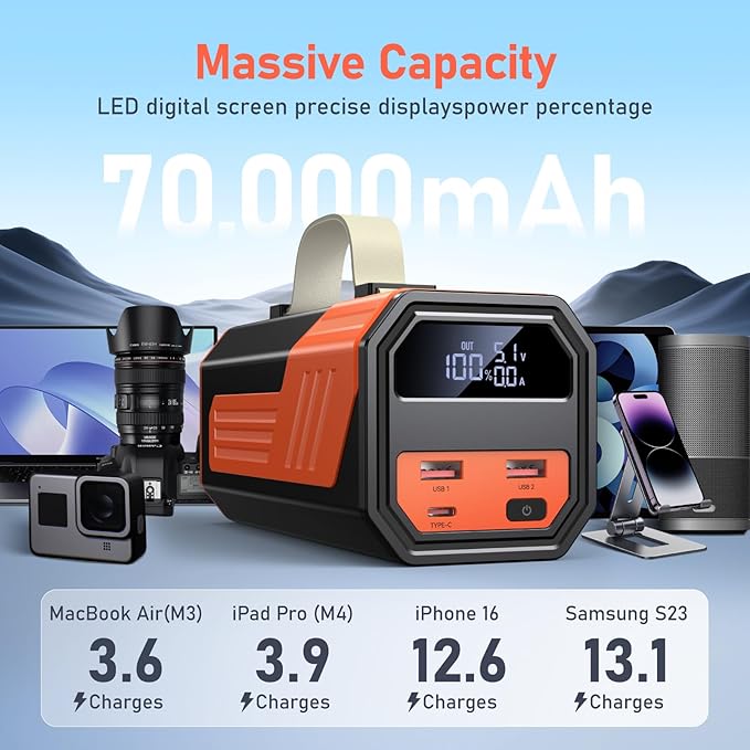 - 70,000mAh High-Capacity Power Bank:With a 70,000mAh high-capacity battery, this power bank supports multiple devices at the same time. It can charge a MacBook Air (M3) 3.6 times, an iPad Pro (M4) 3.9 times, and an iPhone 16 12.6 times, providing over a week of power. Perfect for daily use and extended outdoor adventures.