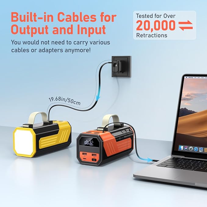 - Built-in 60cm Retractable USB-C Cable:The power bank comes with a high-quality retractable USB-C cable that extends up to 60cm and withstands over 20,000 retractions. It supports both input and output charging. Extend it when needed, retract it neatly when not, and avoid carrying extra cables — ideal for travel and outdoor use.