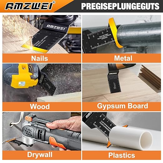 - 【Comprehensive Cutting Kit】Applicable for fast deep and plunge cuts in wood with nails, soft metal, plasterboard and plastic. AMZWEI multi tool blades can be used for building branches, house decoration, door frame floor cutting.