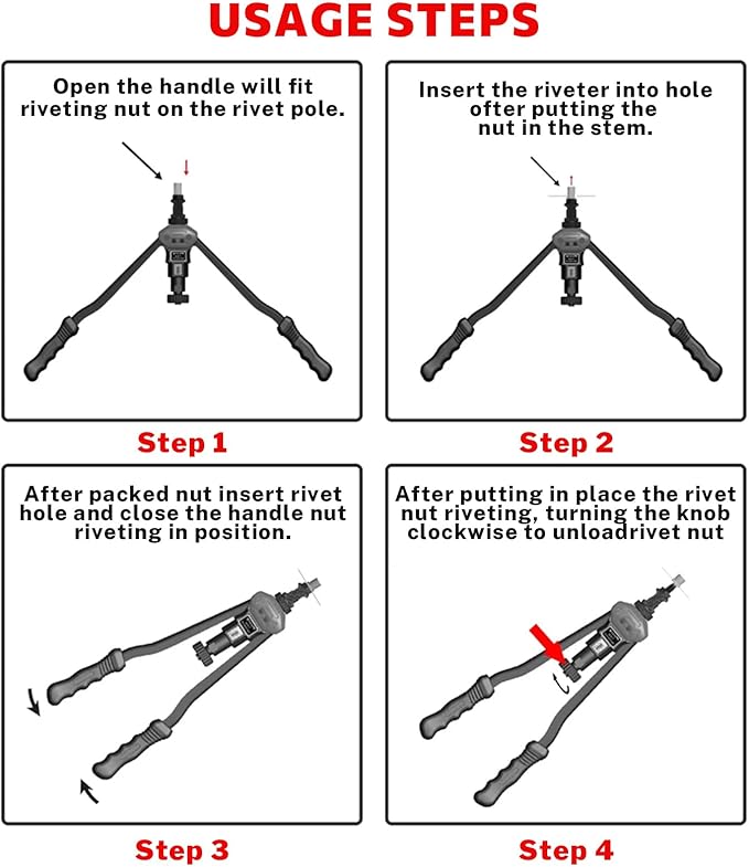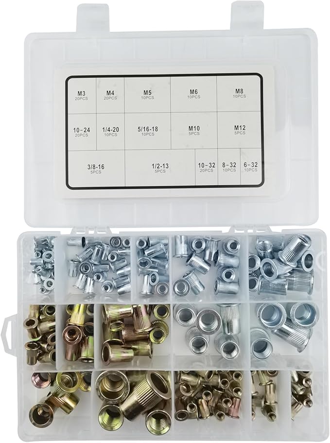 - Includes 15 mandrels (Metric: M3, M4, M5, M6, M8, M10, M12 | SAE: #6-32, #8-32, #10-32, #10-24, 1/4"-20, 5/16"-18, 3/8"-16, 1/2"-13) + 170 rivet nuts (see full breakdown below)