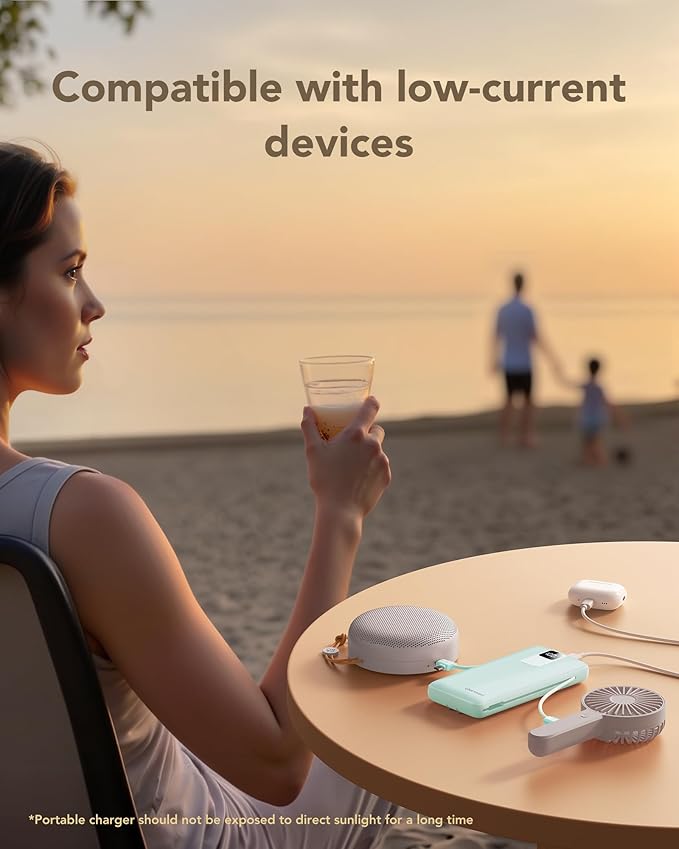 - Universal Compatibility: Features built-in cables for both Apple and Android devices. Supports low-current mode (5V/1A) for safe charging of earphones and portable fans etc, ensuring optimal battery health