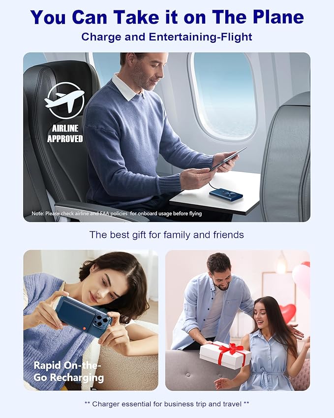- Perfect Size for On-the-Go: This power bank measures just 4.2×2.7×0.7 inches and weighs only 0.43lbs—lighter than most wallets. The ultra-slim design effortlessly fits in pockets or bags, making it the perfect charging partner for business trips, daily commutes, and travel adventures.