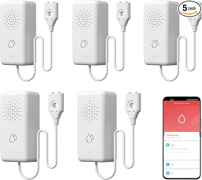 BSEED WiFi Water Leak Detector 5 Pack, Smart Water Sensor with Cable, 85dB Audio/App/SMS/Email Alarm, Rapid Leak Detection for Home, Kitchen, Bathroom, Basement, IP65 Waterproof, No Hub Required