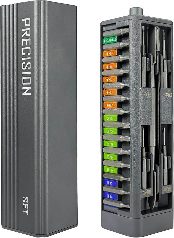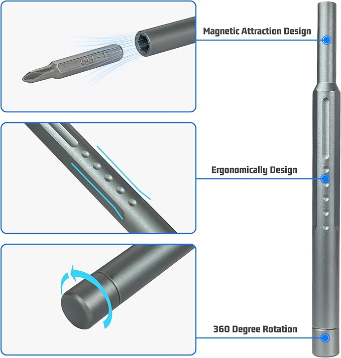 - 【High-Quality, Durable Material】These bits are made of high-quality S2 steel with a hardness of HRC62+, and have undergone heat treatment and CNC-machining to ensure excellent durability and precision. Magnetic tips provide secure handling of small screws, while spare bits for common types like Phillips, Slot, and Tri-point are included to keep your repairs convenient.