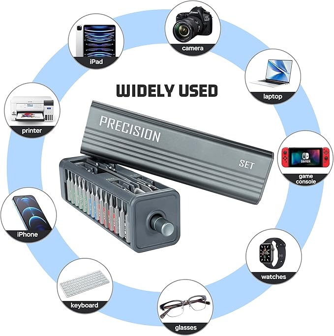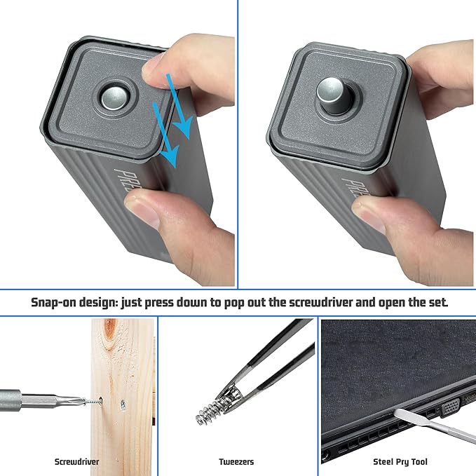 - 【Exquisite Storage Design】The storage box for this precision screwdriver set is made of metal, boasting an exquisite appearance and shock resistance. It features a spring lock inside, where you simply press down on the top to eject the metal storage box. After use, you can insert the accessories into the storage box and press gently to lock it. It's highly convenient and prevents accessories from getting lost.