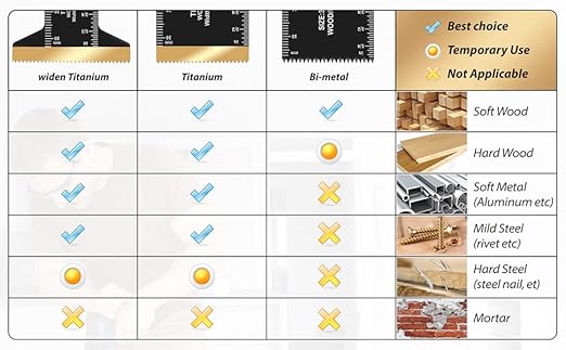 - [ULTRA-DURABLE TITANIUM BLADES]High performance M42 steel, oscillating blades are precision hardened with a titanium coating for twice the cutting speed and wear resistance of other saw blades. The titanium coating allows this blade to maintain low temperatures under frequent use, reducing friction and extending blade life.