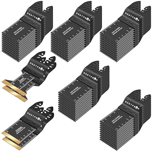 - [OSCILLATING SAW BLADES KIT]50 pcs 1.34" high carbon steel saw blades and 2pcs 1.34" and 2pcs 1.73" titanium oscillating saw blades.A Multi Tool Blades Kits designed for wood working. Facing most of the work for wood working cutting, and in a few cases cutting nails and soft metal.