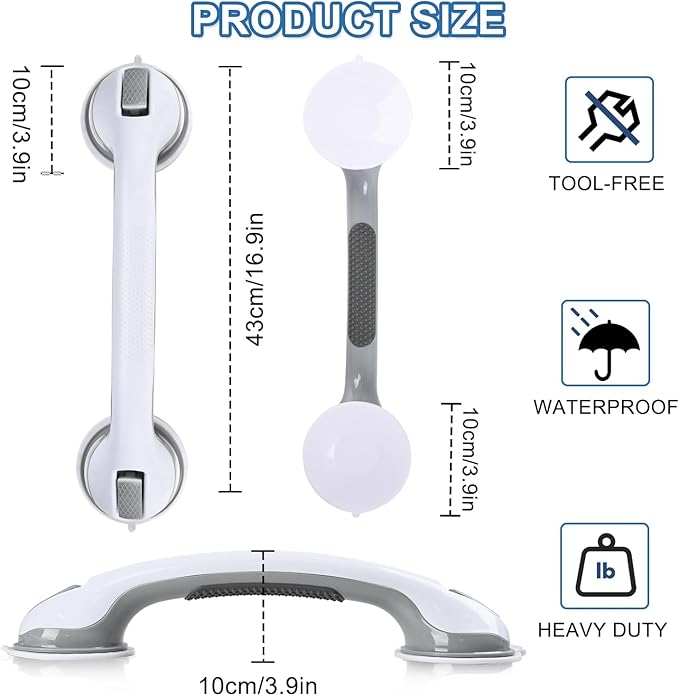 - STURDY & DURABLE: Shower handles for elderly suction are made of sturdy plastic, durable, and not easy to break. 2 suction cups have strong suction, are very stable, and improve safety, can provide assistance in using the shower stool for inside shower and shower chair for bathtub, without worrying about slipping in the bathroom.