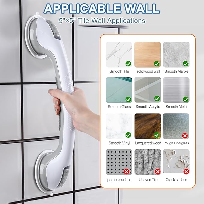 - IMPORTANT NOTE: Grab bars for bathrooms are ONLY suitable for non-porous, flat, smooth surfaces such as tile, glass, acrylic and metal. Please avoid installation on porous surfaces or grout lines. An uneven surface or textured surface will result in a suction cup that is NOT securely fixed. These handicap grab bars are only used to assist and properly support part of body weight, do not press with full weight.