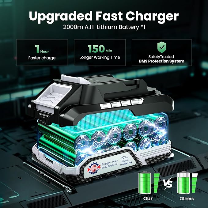 - Truly 2000mAh Battery , 2x Longer Running Time】The cordless drill comes with 20v 2.0Ah battery and charger, powerful battery capacity last 2 timers longer running time, with ONE battery, all tasks finished! The battery with built-in BMS chips to prevent overcharging, overheating, over-discharging, short-circuiting, and power surges for safety use!