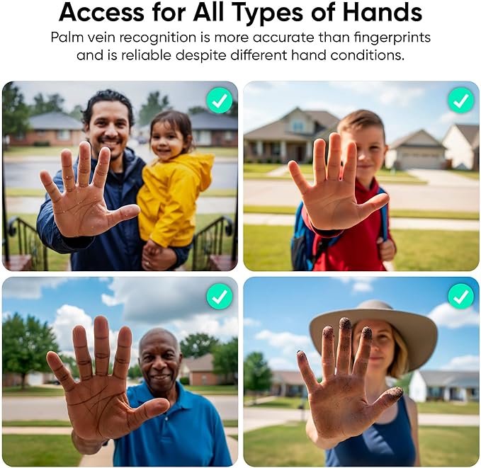 - Contactless Palm Vein Recognition — Wyze Palm Lock uses a highly secure biometric technology that reads the unique vein pattern beneath your palm. Simply hover your hand to unlock—no touch needed. Faster and more reliable than fingerprints.