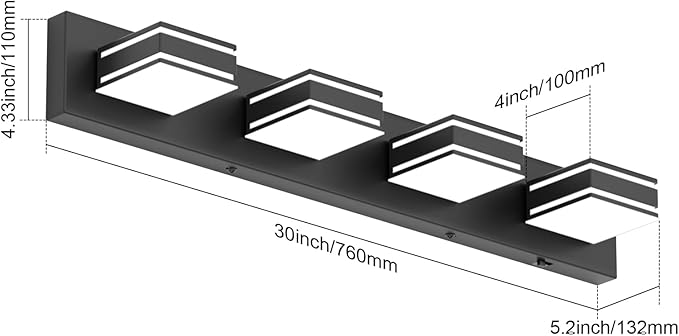 Ralbay 30inch Black Vanity Light for Bathroom with 5 Color Temperatures (3000K-6000K) Dimmable Metal Acrylic Modern LED Matte Black Bathroom Light Fixtures (4-Light)