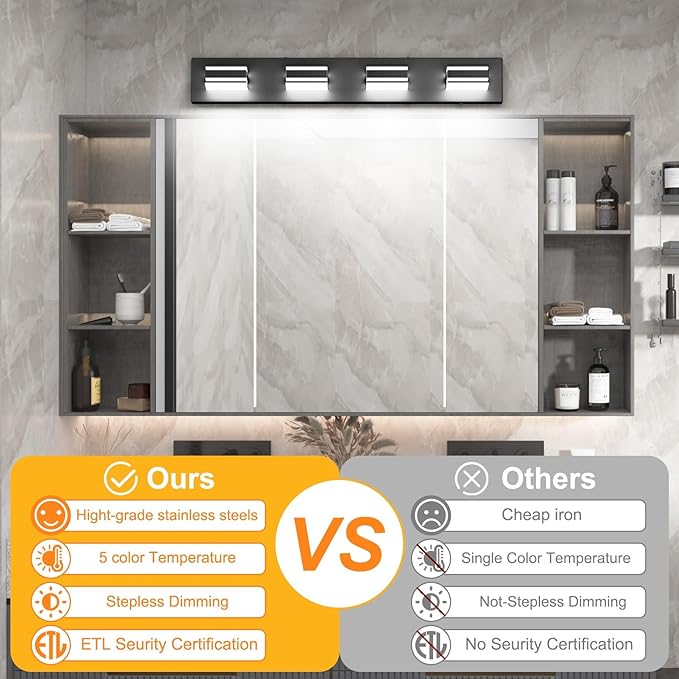 - 1: [5 color temperature & DIMMABLE]: Modern black bathroom vanity light can customize your lighting experience, come with 5 color temperature(warm light3000K~white light6000K). Compared with single color, this is more practical. Lighting can be dimmed by switching on the wall. Smooth & Linear Dimming, meets your different lighting needs. NOTES: The luminaire does not include a dimmer.