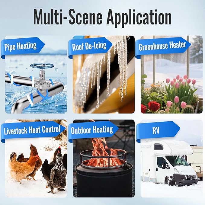 - Versatile Winter Protection: Works with roof de-icing cables, pipe heating cables, chicken house heaters, farm heaters, bird bath heaters, RVs, garages, greenhouses, and standard plug-in thermostats