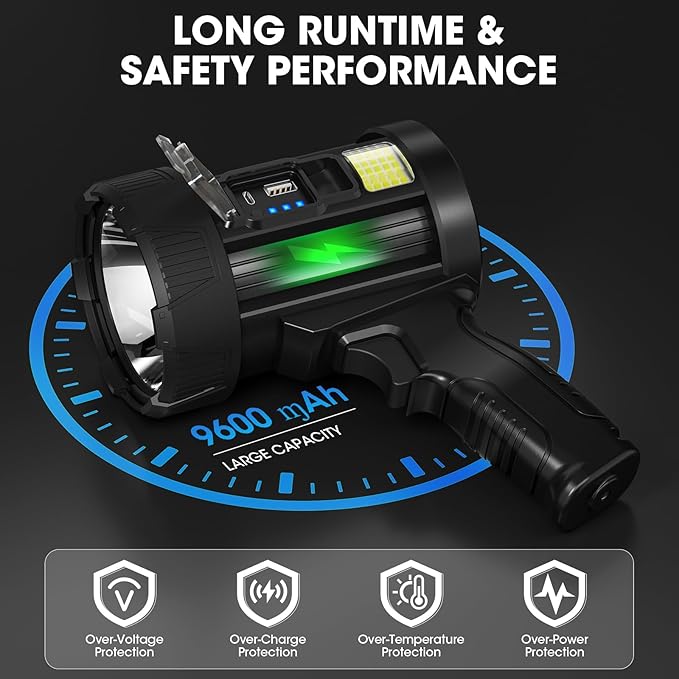 - Super Bright Spotlight - Uses the latest P90.9 chip to produce up to 90,000 lumens of light output. Illumination distance is approximately 6,000 feet(2,000 meters). Kmivo is perfect for your wilderness adventures, camping trips, hiking trips, or at home.